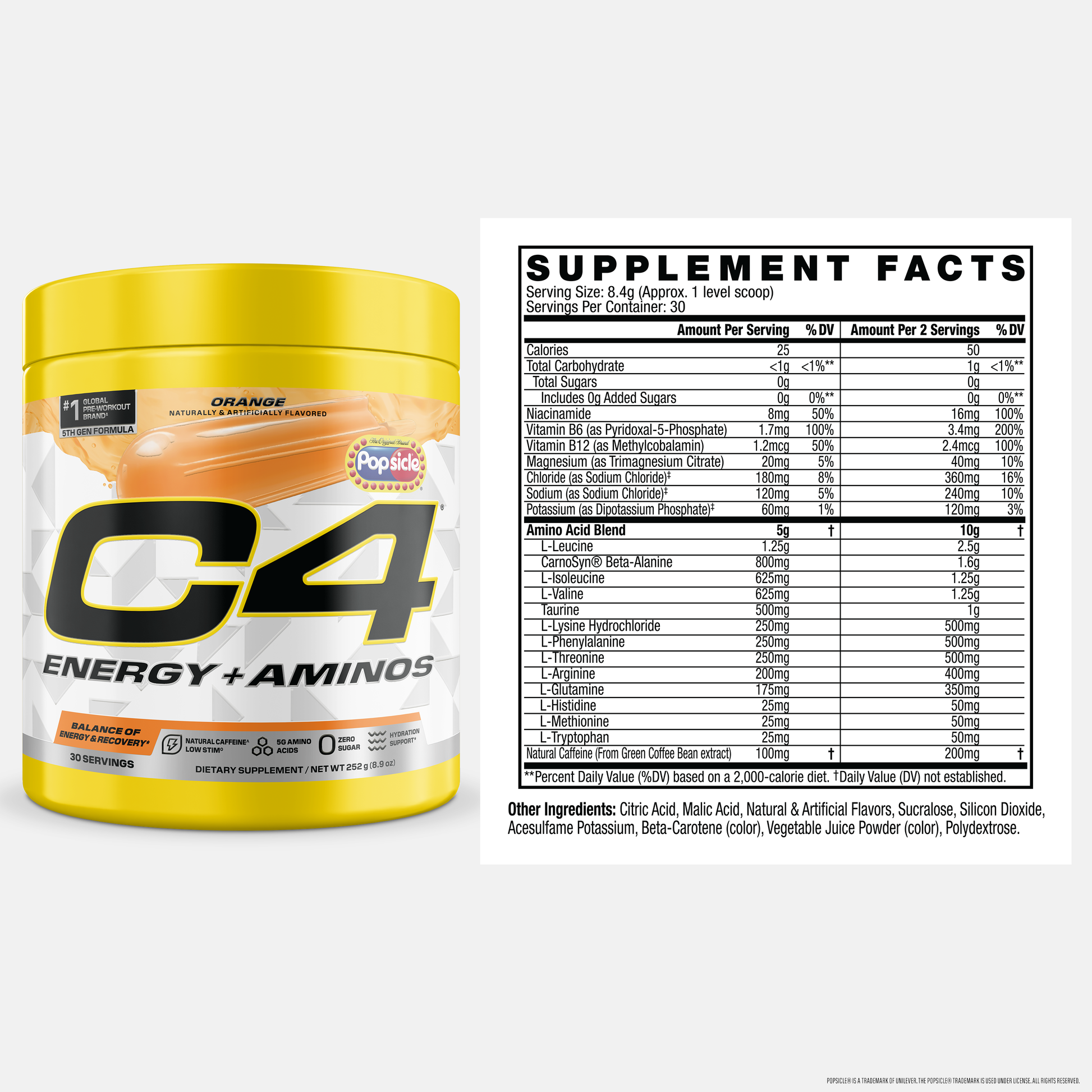 Every scoop is packed with 100mg of caffeine from green coffee beans to boost energy levels and support focus. 5g of amino acids, including BCAAs and EAAs, support muscle growth and repair, along with 3 critical electrolytes. Made with zero sugar, C4 Energy + Aminos x Popsicle® is a delicious and refreshing way to elevate the everyday.*