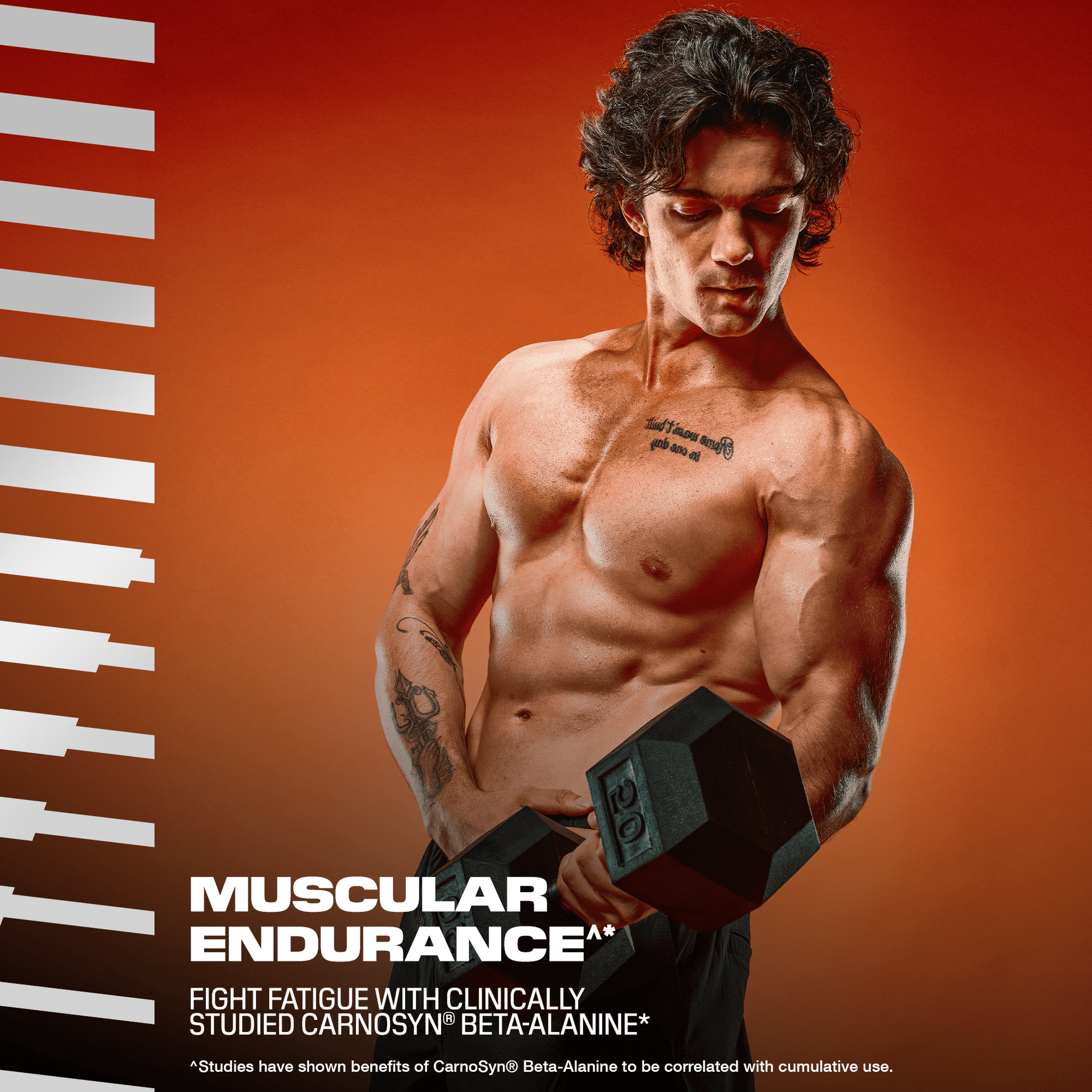 - MUSCULAR ENDURANCE: Combat muscular fatigue with clinically studied CarnoSyn® Beta-Alanine^*.