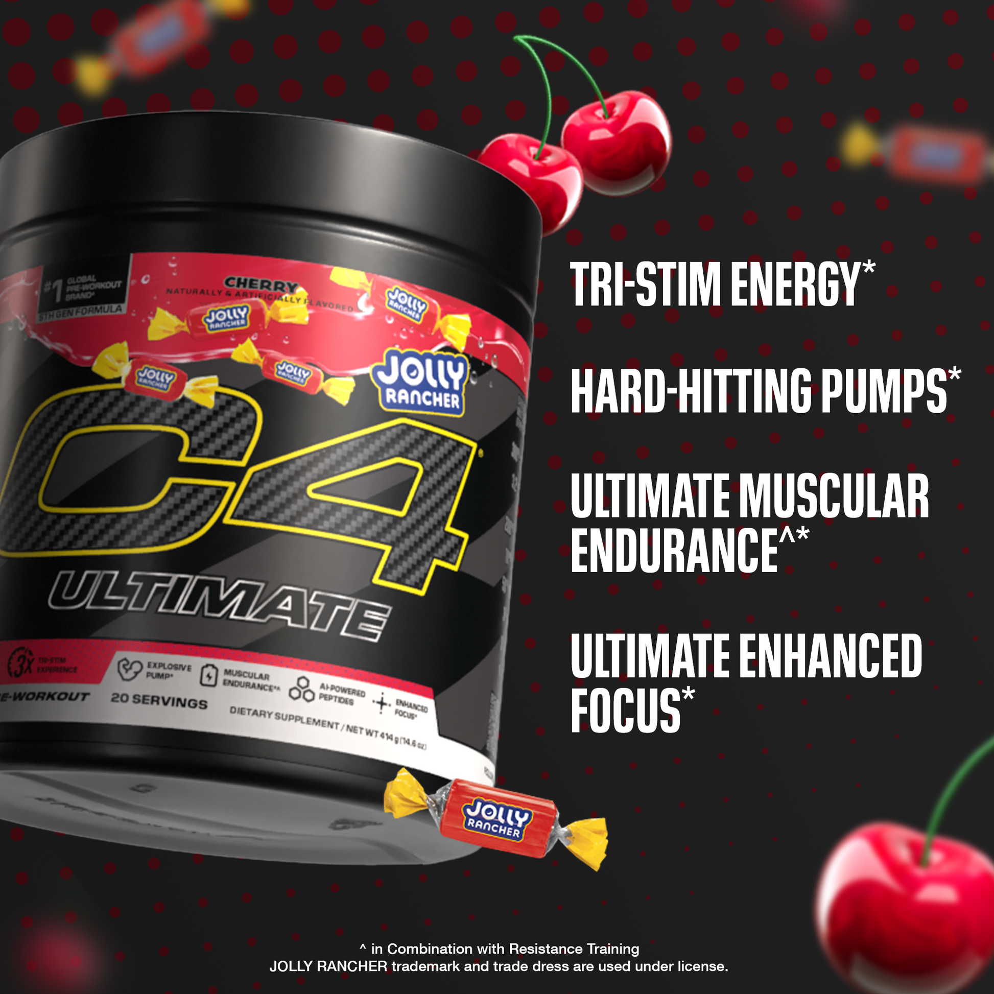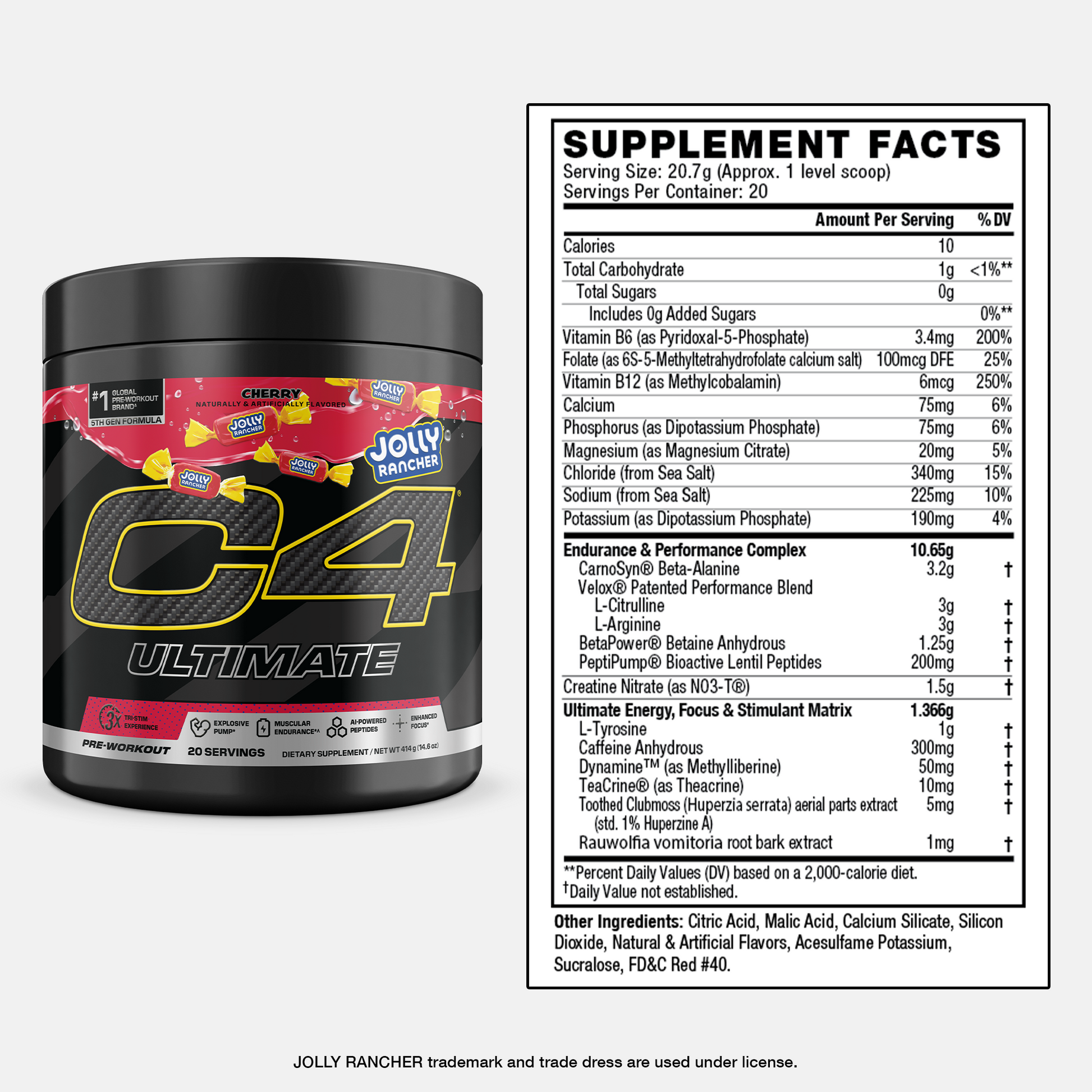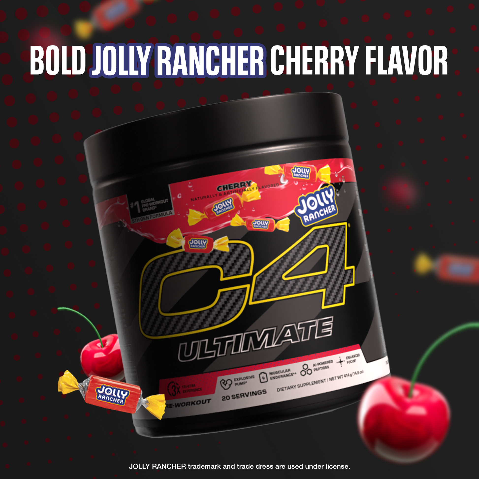 Unwrap ultimate energy with C4 Ultimate® x JOLLY RANCHER! Our Tri-Stim formula packs a potent punch of 300mg of Caffeine, TeaCrine®, and Dynamine™ for a high-stim energy experience that makes your old PR feel like your new warmup weight. Tyrosine and Huperzine A keep you in the zone for a strong mind-muscle connection. Leave no reps in the tank with enhanced muscular endurance from CarnoSyn® Beta-Alanine^ and BetaPower®, and the patented Velox® Performance Blend delivers hard-hitting pumps and enhanced performance. Unstoppable energy meets iconic candy flavor with our most explosive collab yet.*