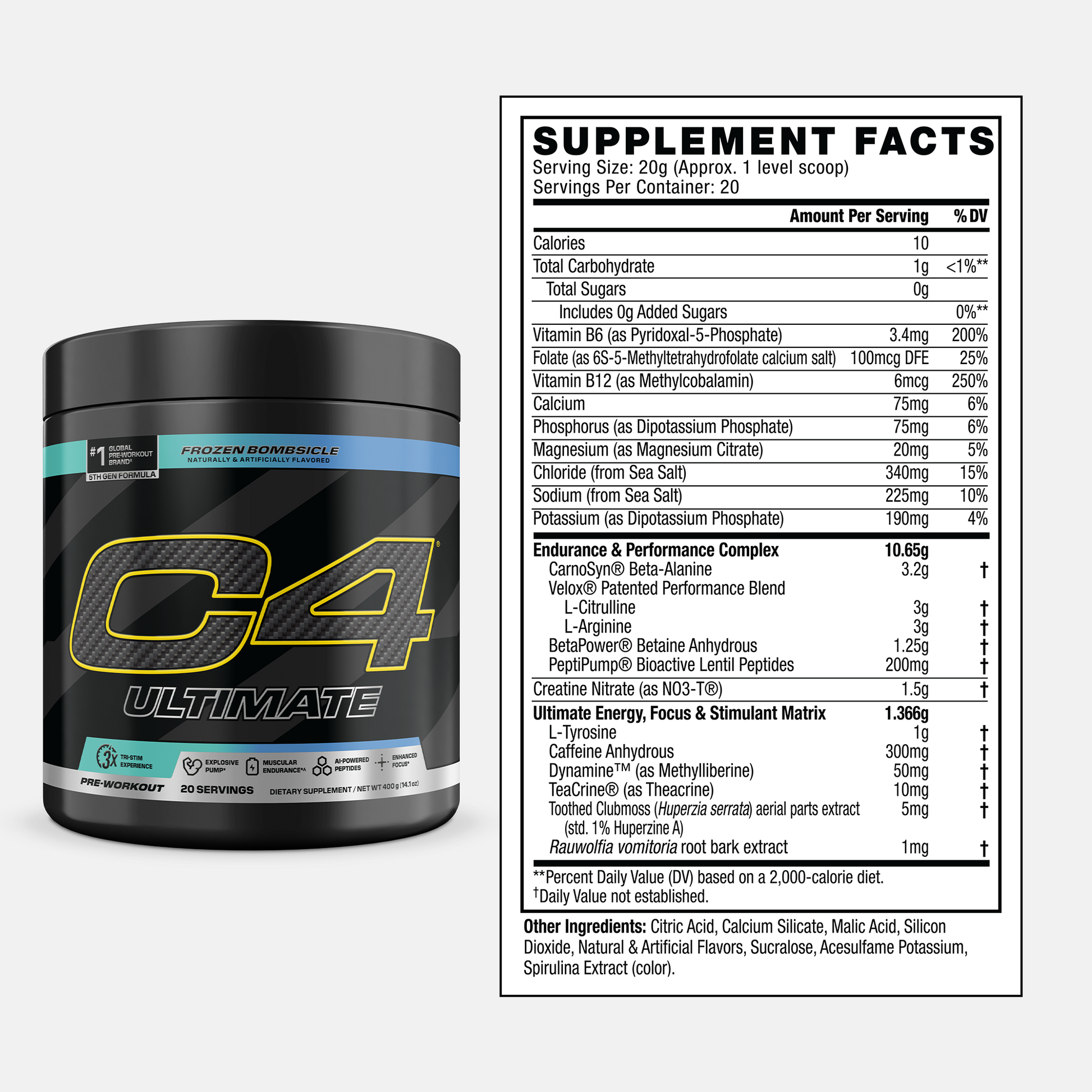 Make every workout hit harder with C4 Ultimate. The Tri-Stim formula features 300mg of caffeine, TeaCrine®, and Dynamine™ for intense, uncompromising energy, plus Tyrosine, and Huperzine A to lock in focus and mind-muscle connection. CarnoSyn® Beta-Alanine, BetaPower® and the Velox® Performance Blend deliver endurance and next-level pumps to help you leave no reps behind.