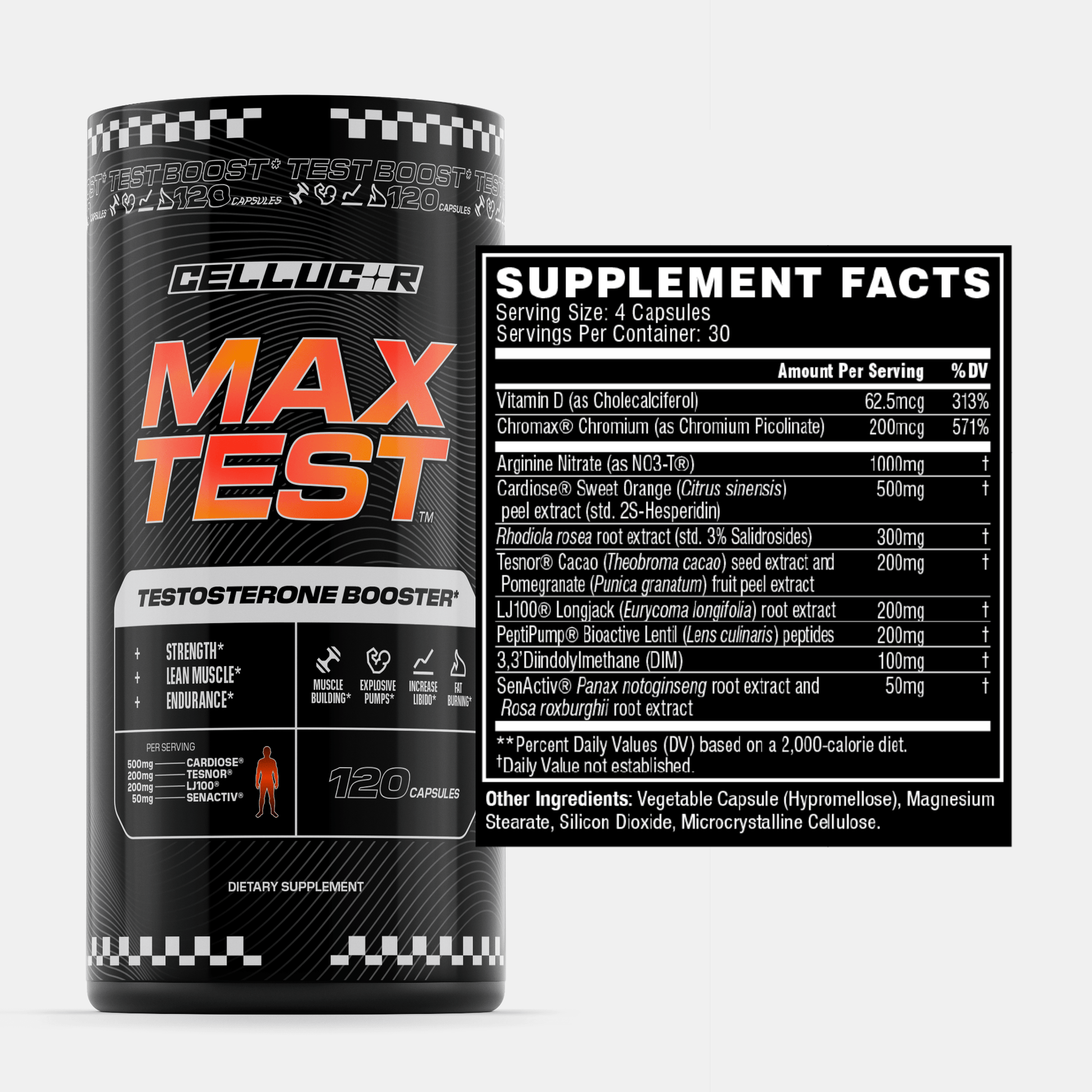 Build muscle, burn fat, and boost endurance with Cellucor Max Test™! Engineered with advanced ingredients, Max Test™ helps boost test levels to achieve that muscular physique.*