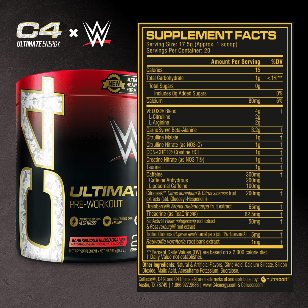 C4’s partnership with WWE® brings you the pre-workout for Ultimate Undisputed Performance – C4 Ultimate. Whether you’re battling it out in the ring or in the gym, C4 Ultimate helps you unleash your inner champion.*Studies have shown benefits of CarnoSyn (R) beta-alanine to be correlated with cumulative use.